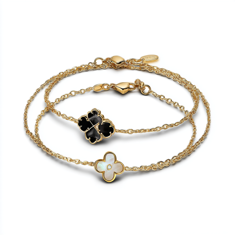 Elevate your style with this exquisite Charlotte & Lexi 2-piece bracelet set. Featuring one bracelet adorned with black enamel clovers and another with luminous mother of pearl clovers, both are crafted from sterling silver with 14K gold plating. The delicate 6.5-inch chains include a 1-inch extender for a customizable fit, while the secure lobster clasp ensures reliable wear. The timeless clover motif design adds a sophisticated charm, perfect for layering or wearing individually, making this set a versatile addition to any jewelry collection.